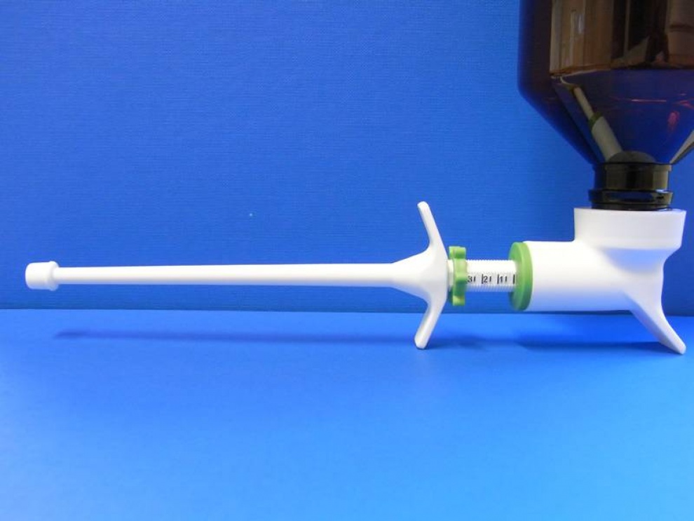 Long nozzle of 120 mm. Adjustable dosage from 1 to 3 ml. For thick and viscous products. Suitable for large size animals. Neck finish diameter of 28 mm. Bottle on request.